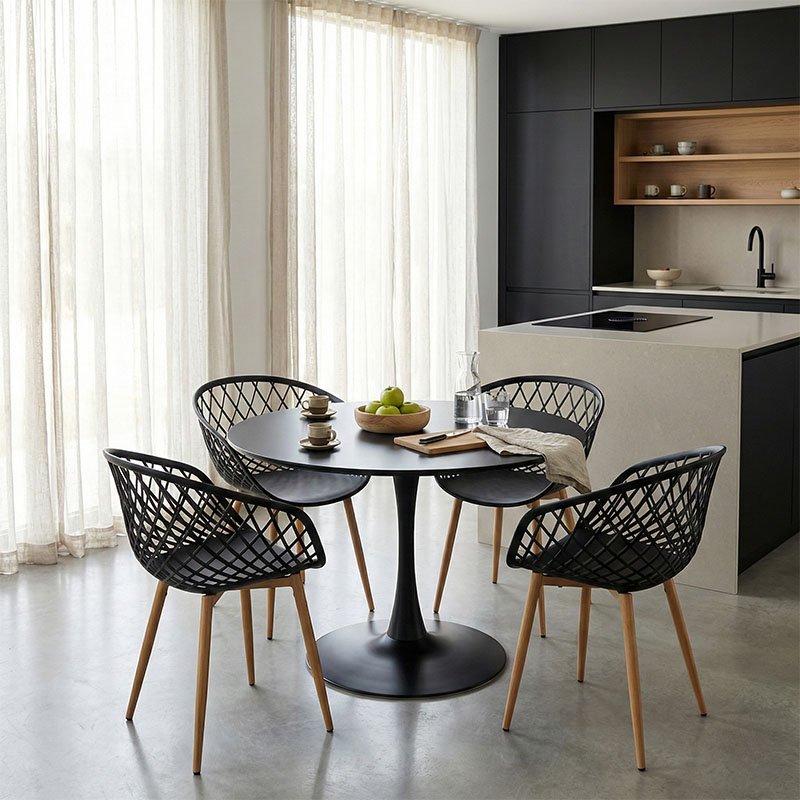 Ενα μοναδικό σετ τραπεζαρίας που συνδυάζει την άνεση με το design και τη ποιότητα με τη λειτουργικότητα. Κατασκευασμένη απο υλικά υψηλής ποιότητας την καθιστά ένα διαχρονικό έπιπλο. Το μαύρο χρώμα προσδίδει έναν αέρα σοφιστικέ, ενώ τα ξύλινα πόδια δημιουργούν μια ζεστή αντίθεση.